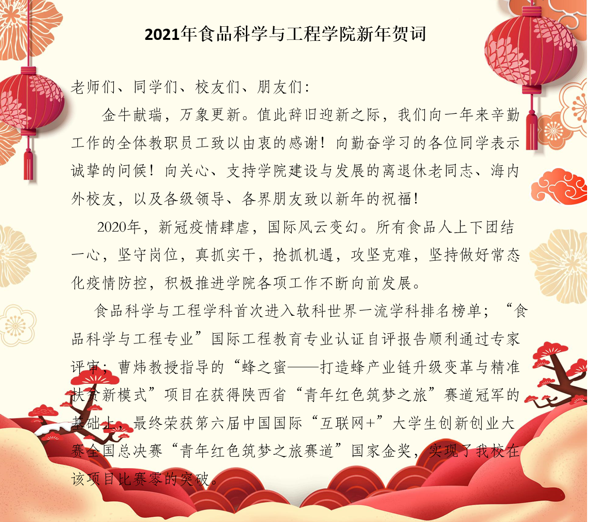 威尼斯9499登录入口成立于2017年,是在2002年成立的威尼斯9499登录入口化工学院食品工程系的基础上,汇集西北农林科技大学食品科学与工程、威尼斯9499登录入口食品科学与工程、生命科学等相关专业的师资力量组建而成。学院现有二级学科博士点1个,一级学科硕士点1个,二级学科硕士点1个。 学院现有专职教师45人,其中教授9人,副教授21人,讲师15人,100%的教师具有博士学位,80%的教师有海外留学经历。教师队伍中有原国务院学位委员会学科评议组专家1人,享受国务院特殊津贴专家1人,教育部新世纪人才2人,陕西省“三五”人才1人,陕西省科技创新领军人才2人和陕西青年科技奖获得者2人。学院拥有“朱蓓薇院士工作站”、“陕西省食品安全风险识别控制技术研究中心”、“陕西省营养健康食品个性制造工程实验室”、“陕西省食品安全与营养健康创新转化平台”和“陕西省蜂产品工程技术研究中心”、“陕西省天然多糖资源利用工程研究中心”等科研平台...