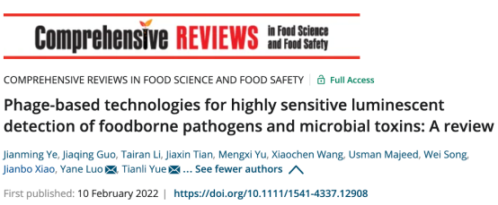 近日,威尼斯9499登录入口岳田利教授和骆艳娥教授团队于2022年2月在国际期刊Comprehensive Reviews in Food Science and Food Safety(Q1,IF: 12.81)(点击查询即时影响IF)发表题为“Phage-based technologies for highly sensitive luminescent detection of foodborne pathogens and microbial toxins: A review”的综述性文章被选为封面论文。