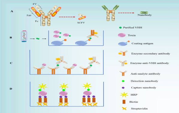 图6 基于免疫分析的微生物毒素检测。A组:抗体类似物;B:包被抗原与其特殊抗体类似物之间的相互作用;图C:固定化霉菌毒素与其抗体类似物之间的相互作用;D组:夹心ELISA间接检测细菌毒素。