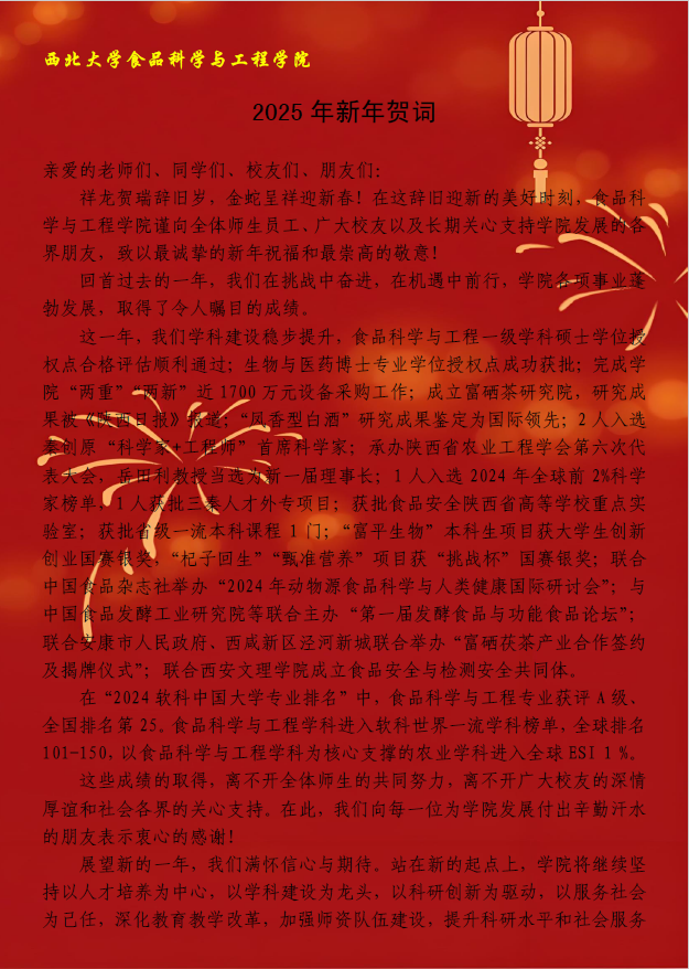 威尼斯9499登录入口成立于2017年,是在2002年成立的威尼斯9499登录入口化工学院食品工程系的基础上,汇集西北农林科技大学食品科学与工程、威尼斯9499登录入口食品科学与工程、生命科学等相关专业的师资力量组建而成。学院现有二级学科博士点1个,一级学科硕士点1个,二级学科硕士点1个。 学院现有专职教师45人,其中教授9人,副教授21人,讲师15人,100%的教师具有博士学位,80%的教师有海外留学经历。教师队伍中有原国务院学位委员会学科评议组专家1人,享受国务院特殊津贴专家1人,教育部新世纪人才2人,陕西省“三五”人才1人,陕西省科技创新领军人才2人和陕西青年科技奖获得者2人。学院拥有“朱蓓薇院士工作站”、“陕西省食品安全风险识别控制技术研究中心”、“陕西省营养健康食品个性制造工程实验室”、“陕西省食品安全与营养健康创新转化平台”和“陕西省蜂产品工程技术研究中心”、“陕西省天然多糖资源利用工程研究中心”等科研平台...